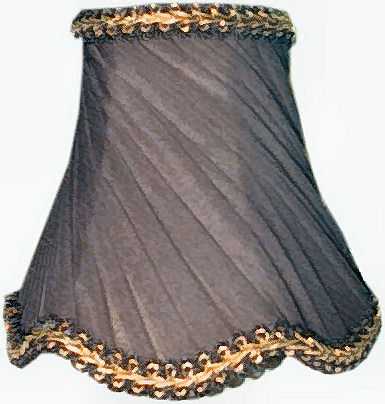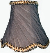 Ding Victorian Chandelier Shade - this gorgeous shade is done with a black chiffon twisted design and trimmed with black and gold metallic gimp. Shade has a clip top for flame tip bulb clip. Can be ordered in variety of color & trim combinations. Frame is 4" tall. Price $89.00 as pictured. Price varies depending on fabrics and trims. |