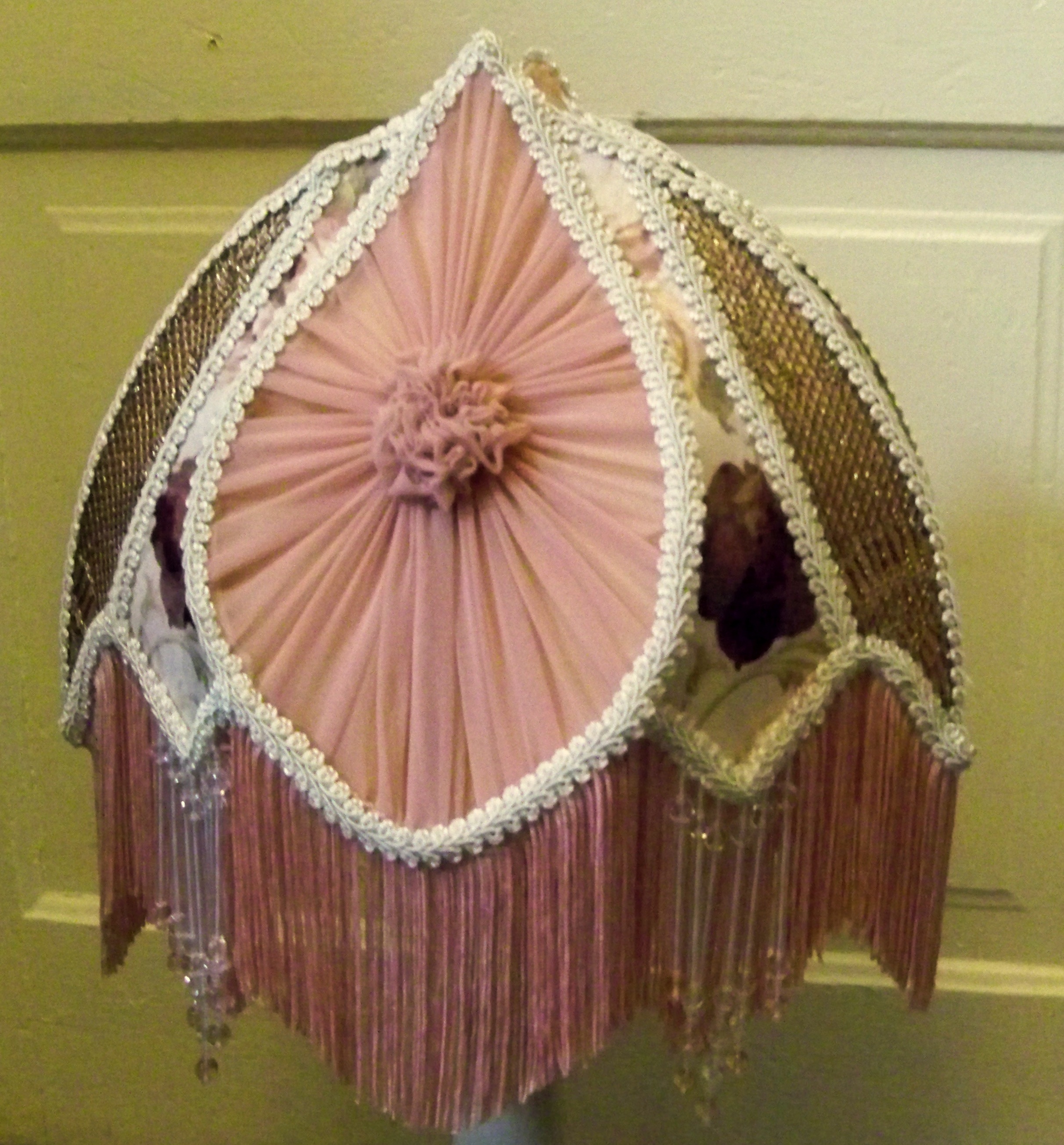 Victorian Open Tulip (small) - This shade is made with a gorgeous floral Damask in shades of pink, burgundy and gold on a cream background in the larger panels of the shade and has hummingbirds in the smaller sections. The smaller sections have candied glass which gives them a beautiful crystallized look. Finished off with off-white chainette fringe, gimp and them smaller sections are adorned with pearl style beaded fringe. This Victorian Frame comes with standard top ring and is available in larger sizes also. This Victoran Frame is 6" tall and with fringes, it is 10" tall. Price $229.00 as pictured. Price varies depending on fabrics, fringes, trims and candied glass. |