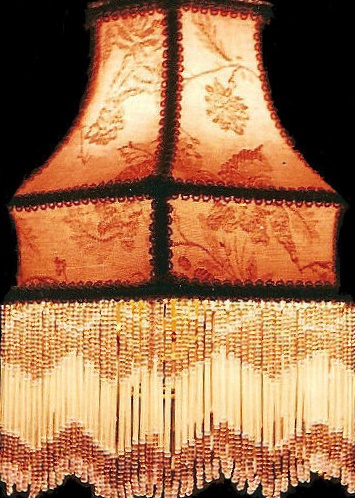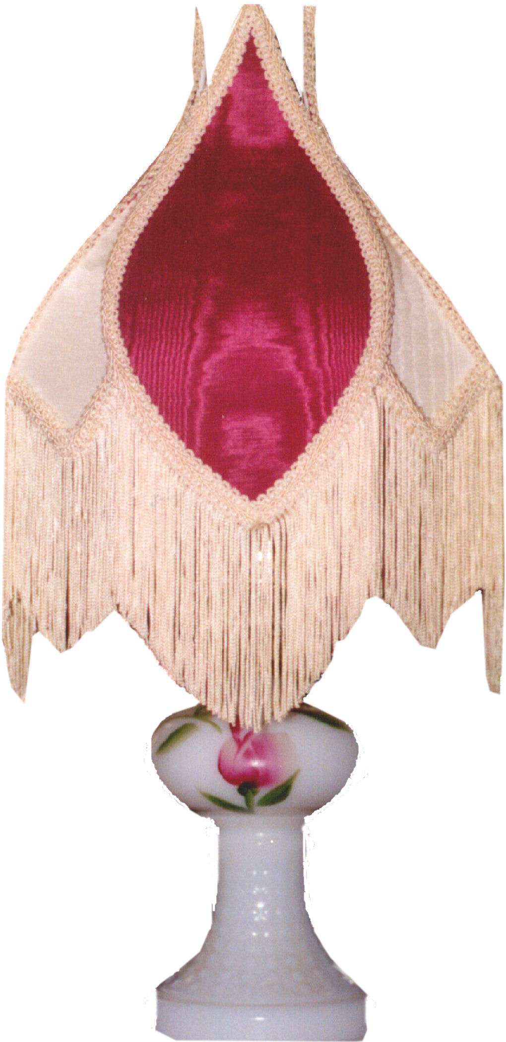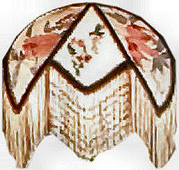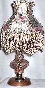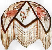 Victorian Flame - frame is adorned with a multi- colored Jacquard fabric, center rosette and corner sections are done with a mauve satin, thick rayon fringe dyed to a matching mauve shade, glass beaded fringe and trimmed in a light camel gimp. This victorian frame comes with a standard top ring. Frame is 9" tall and with the fringes, overall height is 15" tall. Price $209.00 as pictured. Price varies depending on fabrics, fringes and trims. |