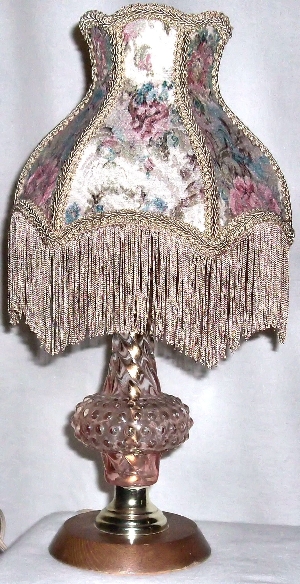 Victorian Lil's Hex - this dainty shade is done in a beautiful mauve jacquard fabric, mauve gimp with light mauve and crystal glass beaded fringe. This frame has a standard top ring and is also available with flame tip bulb clip. Frame is 6 1/2" tall and with 4" fringe, the completed shade is 10 1/2" tall. Price $129.00 as pictured. Price varies depending on fabrics, trim, rayon fringe or beaded fringe. |