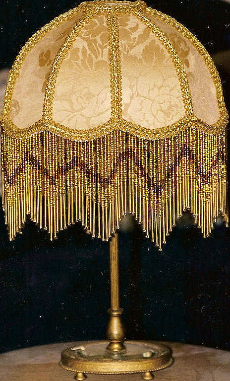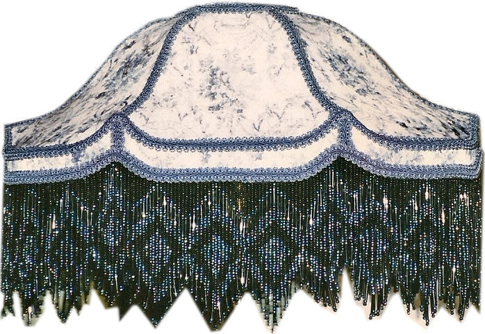 Small Victorian Crown Lamp Shade - this petite lamp shade is made with alternating panels of gold and blue Damask faric with antique gold trim and beautiful 6" beaded fringe. This frame has a standard top ring and measures approximately 12" tall including beaded fringe and is 7" wide. Price $199.00 as pictured. Price varies depending on fabrics and trims. |